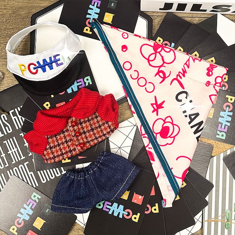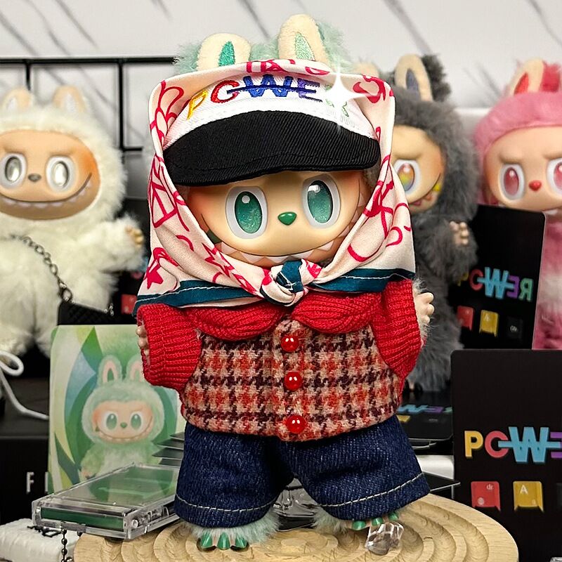 Mettez en valeur votre figurine Labubu avec ce look vibrant aux accents vintage et arty ! Ce costume complet comprend une casquette bicolore brodée, un foulard imprimé, un haut en maille rouge à motif pied-de-poule et une jupe/short en jean. Un style assumé, créatif et haut en couleur, parfait pour les amateurs de looks uniques et expressifs.